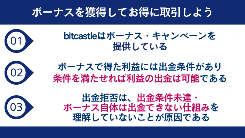 - bitcastleボーナスの出金拒否は、ボーナスの仕組みを理解していないことが原因