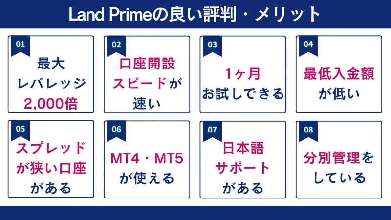 - Land Primeの良い評判・メリットは「最大レバレッジ2,000倍」「口座開設スピードが速い」「1か月お試しトレードができる」などの8つある