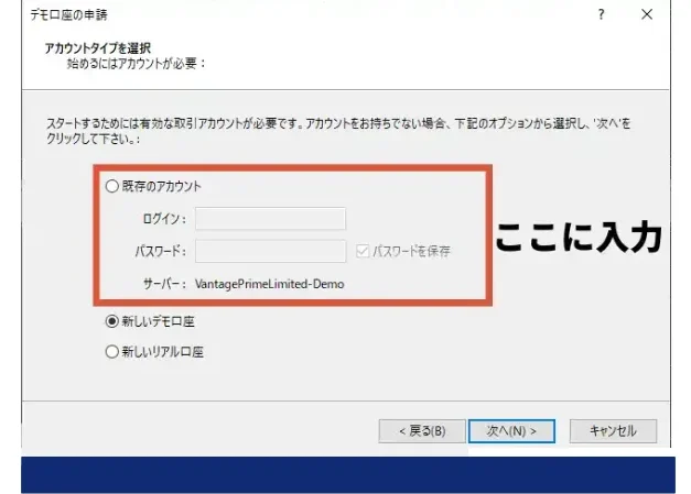 Vantage Tradingのデモ口座のサーバーは「VantagePrimeLimited-Demo」です。