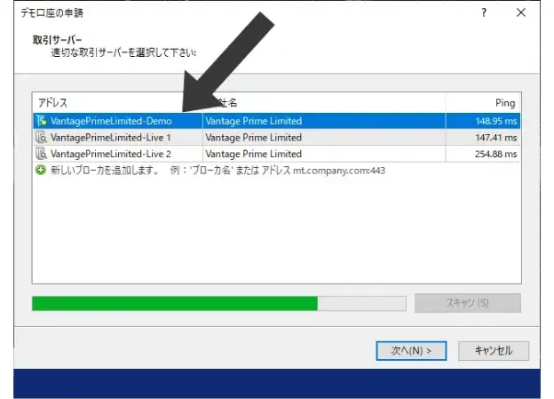Vantage Tradingのデモ口座のサーバーを選択します。