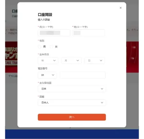 個人情報を入力する画面が自動表示されますが、デモ口座の時点では入力の必要がありません。右上のバツマークをクリックして閉じてください。