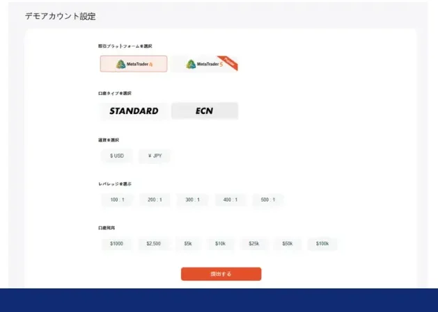 デモ口座で利用したい取引プラットフォーム・口座タイプ・基軸通貨・最大レバレッジバーチャルマネーの残高を選択してください。