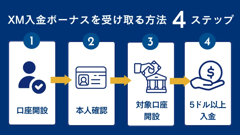 XMの新規口座開設ボーナスの受け取り手順は以下の3ステップです。